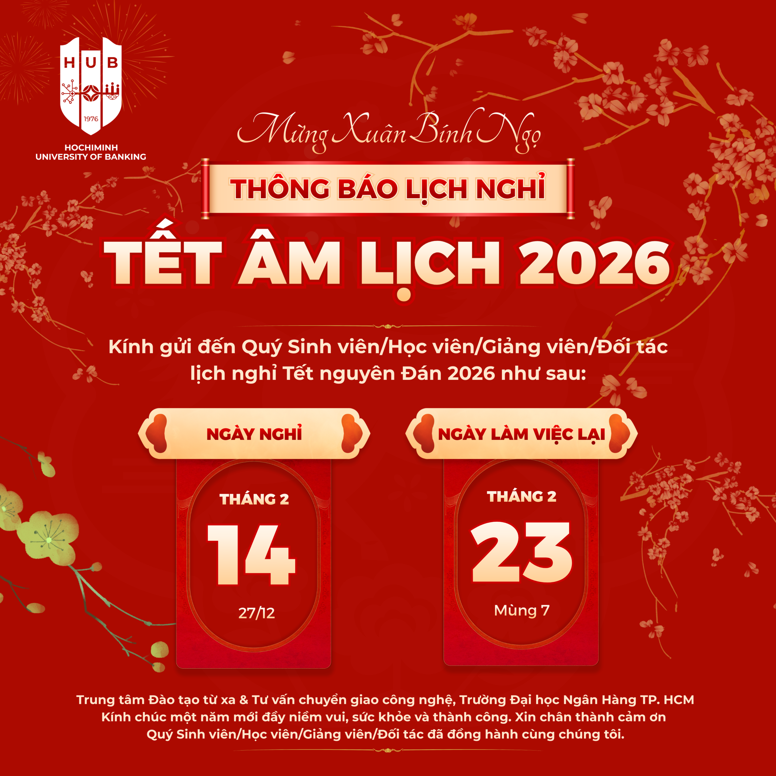 Trung tâm Đào tạo từ xa & Tư vấn chuyển giao công nghệ – Trường Đại học Ngân hàng TP. Hồ Chí Minh trân trọng thông báo đến Quý Sinh viên, Học viên, Giảng viên và Đối tác lịch nghỉ Tết Nguyên đán Bính Ngọ 2026 như sau: