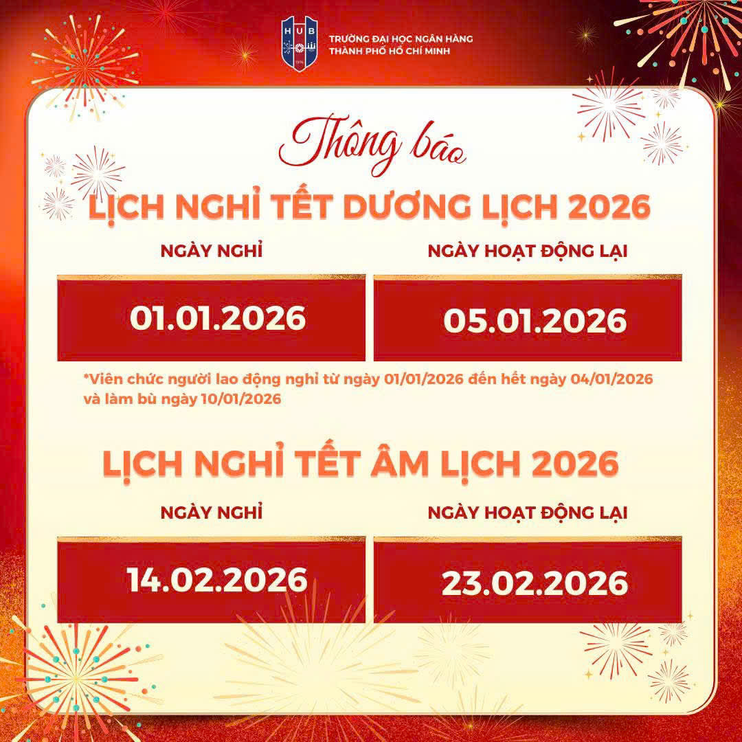 🌸 Trường Đại học Ngân hàng TP. Hồ Chí Minh (HUB) trân trọng thông báo lịch nghỉ Tết Dương lịch và Tết Âm lịch nhằm tạo điều kiện để quý thầy cô giảng viên – viên chức, người lao động và người học chủ động sắp xếp kế hoạch học tập, công tác.